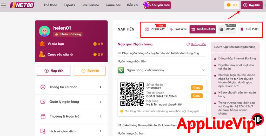 Các hình thức nạp tiền tại Net88